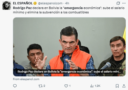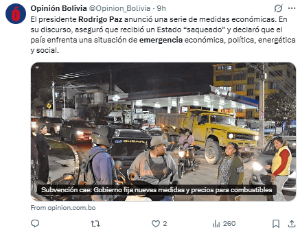 Regeneración, 18 de diciembre 2025– El presidente de Bolivia, Rodrigo Paz, promulgó un decreto en el que declara emergencia económica, financiera, energética y social; y dispone el fin del subsidio a hidrocarburos, estableciendo medidas para la reactivación económica y la protección de ingresos.