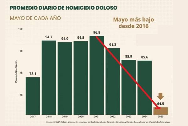 Además, de que mayo de 2025 es el mayo más bajo en cuanto a promedio de homicidios dolosos desde 2016, lo que evidencia la tendencia a la baja en dicho delito.