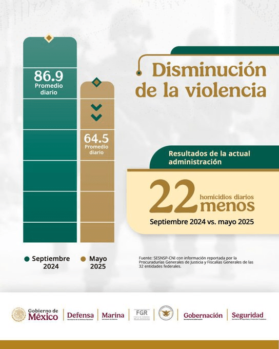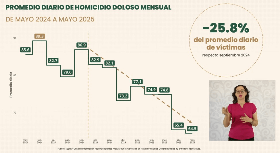 Lo anterior, de septiembre de 2024 a mayo de 2025, lo que significa 22 homicidios diarios menos que en septiembre del año pasado.