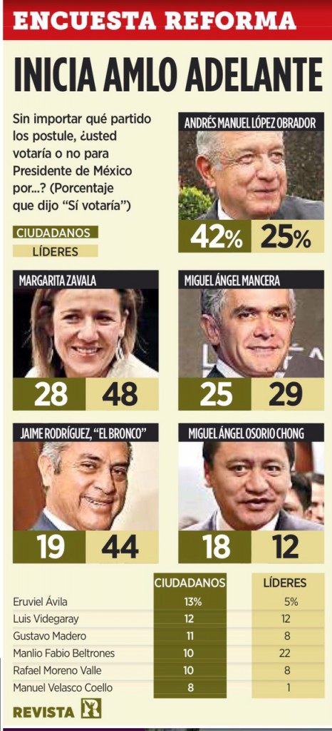 Regeneración, 2 de agosto de 2015. De acuerdo con una encuesta publicada este domingo por el diario Reforma, Andrés Manuel López Obrador es el aspirante a la presidencia con el mayor nivel de aprobación entre los ciudadanos.