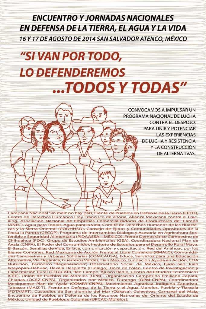 Regeneración, 13 de agosto de 2014. Más de 50 organizaciones civiles, sociales y comunitarias convocan al Encuentro y Jornadas nacionales en defensa y apropiación social de la tierra, el agua y la vida, que se realizará este fin de semanas, el 16 y 17 de agosto en San Salvador Atenco. De acuerdo con los organizadores, la actividad continuará con varias jornadas de resistencia en los próximos tres meses más, que culminarán en una movilización nacional el 6 de diciembre de 2014, fecha en que se cumplen 100 años del momento en que los ejércitos campesinos de Francisco Villa y Emiliano Zapata entraron en la capital enarbolando la bandera de ¡Tierra y Libertad!