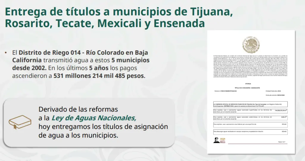 Regeneración 23 de marzo de 2026. En un hecho histórico, Presidenta entrega por primera vez títulos de concesión de agua a Tijuana, Rosarito, Mexicali, Tecate y Ensenada, cinco de los siete municipios de Baja California.
