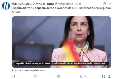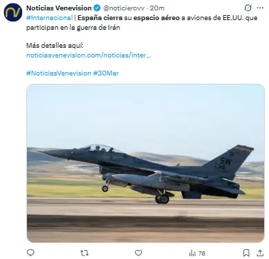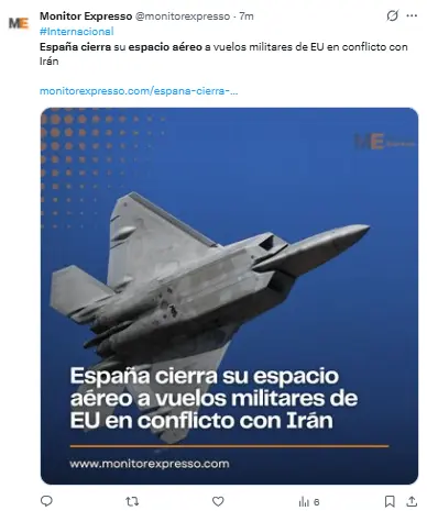 Regeneración, 30 de marzo 2026– El Gobierno de España anunció el lunes que su espacio aéreo estará cerrado para aeronaves estadounidenses que participen en la guerra en Irán. Aviones de EE. UU. que pretendan usar el espacio aéreo español con otros fines, tendrán paso libre.