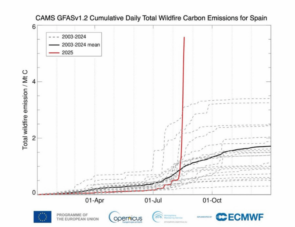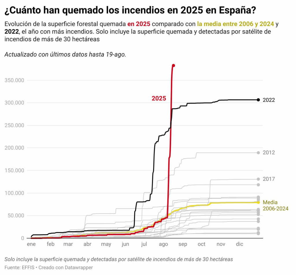Asimismo, se indica que el año 2025 se perfila como uno de los más devastadores en cuanto a incendios forestales en España.