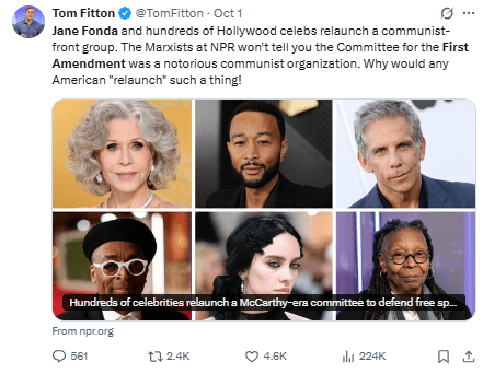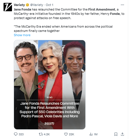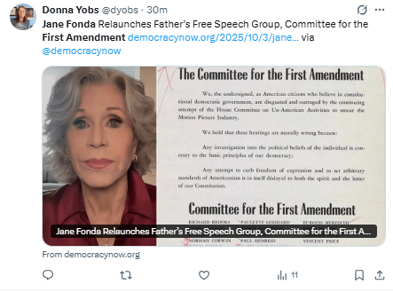 Regeneración, 5 de octubre 2025– 550 artistas de EE.UU relanzaron el Comité para la Primera Enmienda. Una iniciativa de libertad de expresión originalmente encabezada por Henry Fonda, en respuesta al auge del macartismo durante la década de 1940.