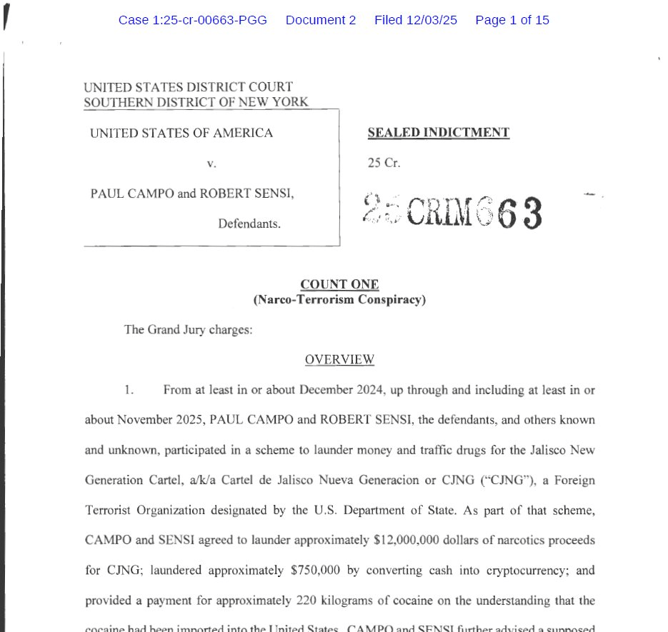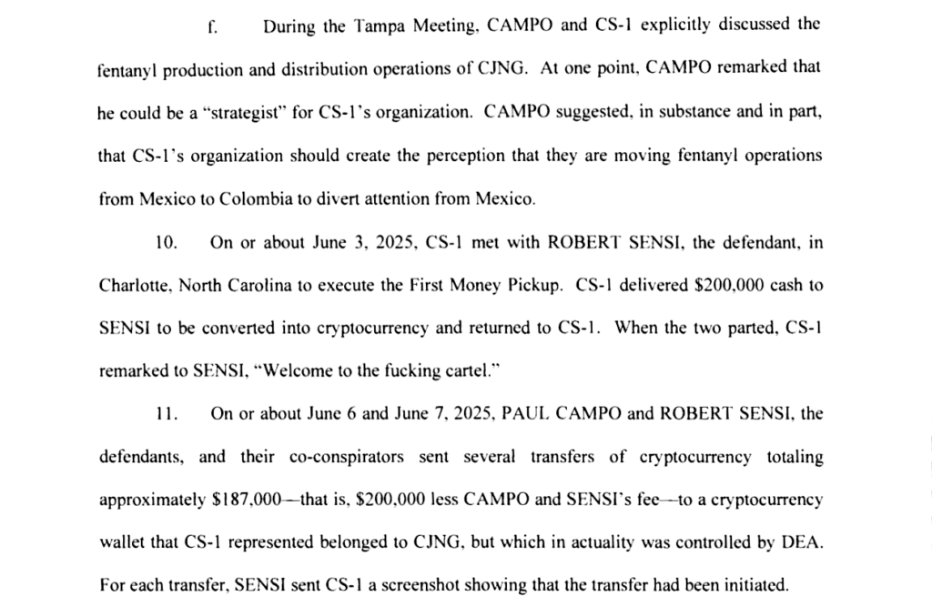 Tras varias reuniones adicionales, Sensi y Campo acordaron lavar dinero del CJNG convirtiéndolo en criptomonedas y mediante la compra de diversos bienes raíces.