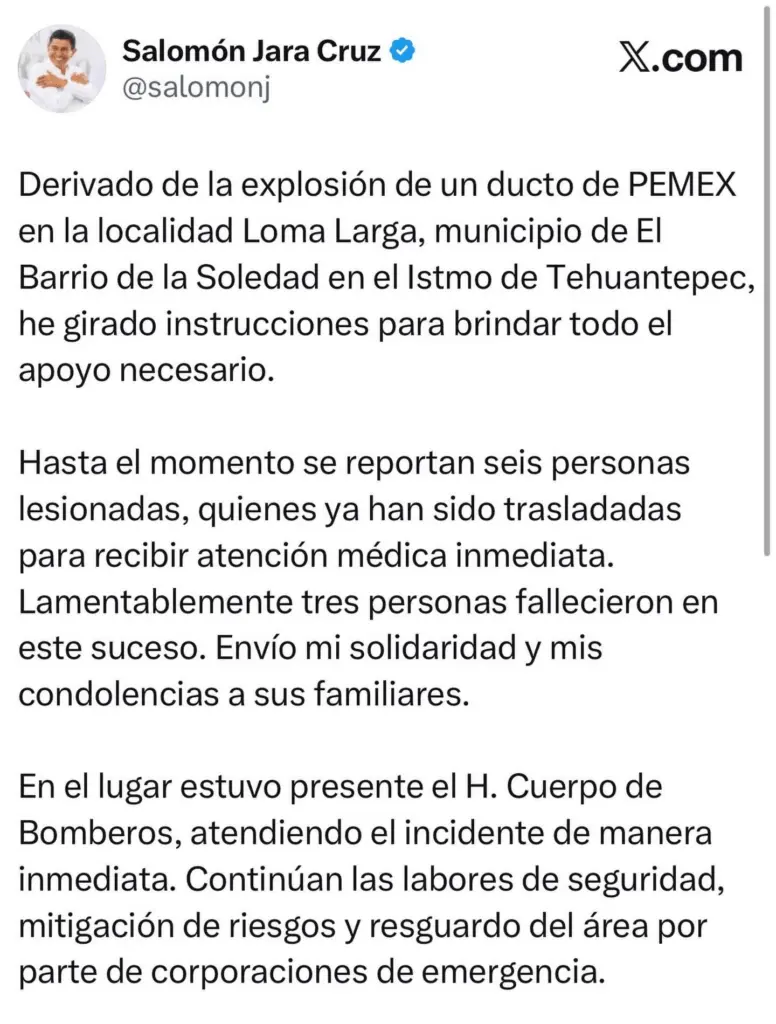 Regeneración, 10 de febrero 2026– Un saldo de al menos tres personas fallecidas y seis heridas fue el resultado de una explosión en un ducto de Petróleos Mexicanos (Pemex) en Loma Larga, Oaxaca, según lo comunicó el gobernador Salomón Jara en redes sociales.