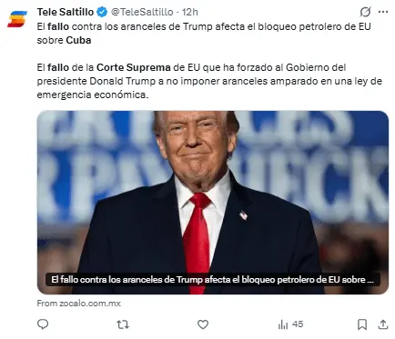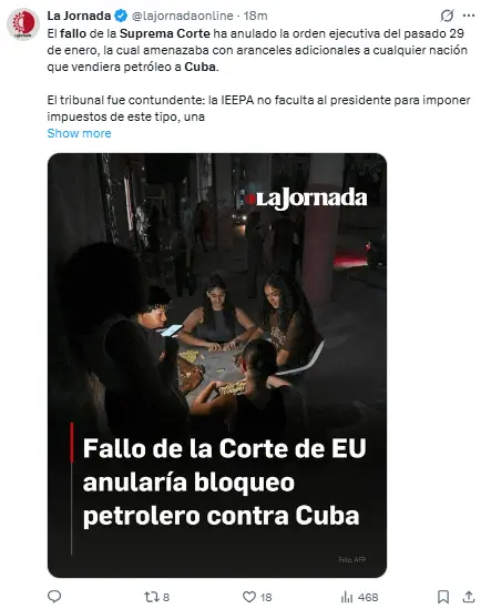 Regeneración, 24 de febrero 2026– La Corte Suprema de Estados Unidos (SCOTUS) ha dado un veredicto que, en efecto, elimina la orden ejecutiva que amenaza con tarifas adicionales a cualquier nación que envíe petróleo a Cuba, permitiendo así que países como México reanuden sus exportaciones a la isla.
