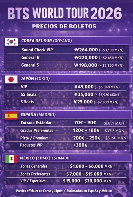 Cabe destacar que los conciertos: 7, 9 y 10 de mayo de 2026, Estadio GNP Seguros, CDMX. Preventa ARMY MEMBERSHIP: viernes 23 de enero de 2026.