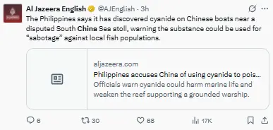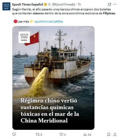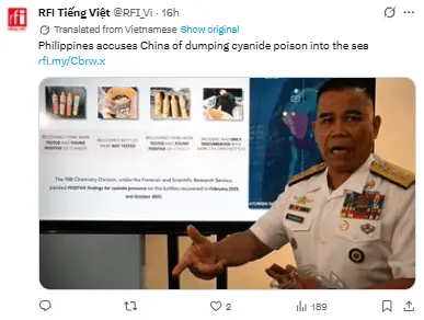 Regeneración, 13 de abril 2026– Filipinas sostiene que ha encontrado cianuro en embarcaciones chinas cerca de un atolón en disputa en el Mar de China Meridional, advirtiendo que esta sustancia podría ser empleada para «sabotear» las poblaciones de peces locales.