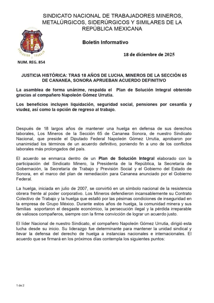 Regeneración, 19 de diciembre de 2025.– La resistencia obrera en Sonora finalmente dio frutos. Tras 18 años de dignidad, la huelga de Cananea ha llegado a su fin.