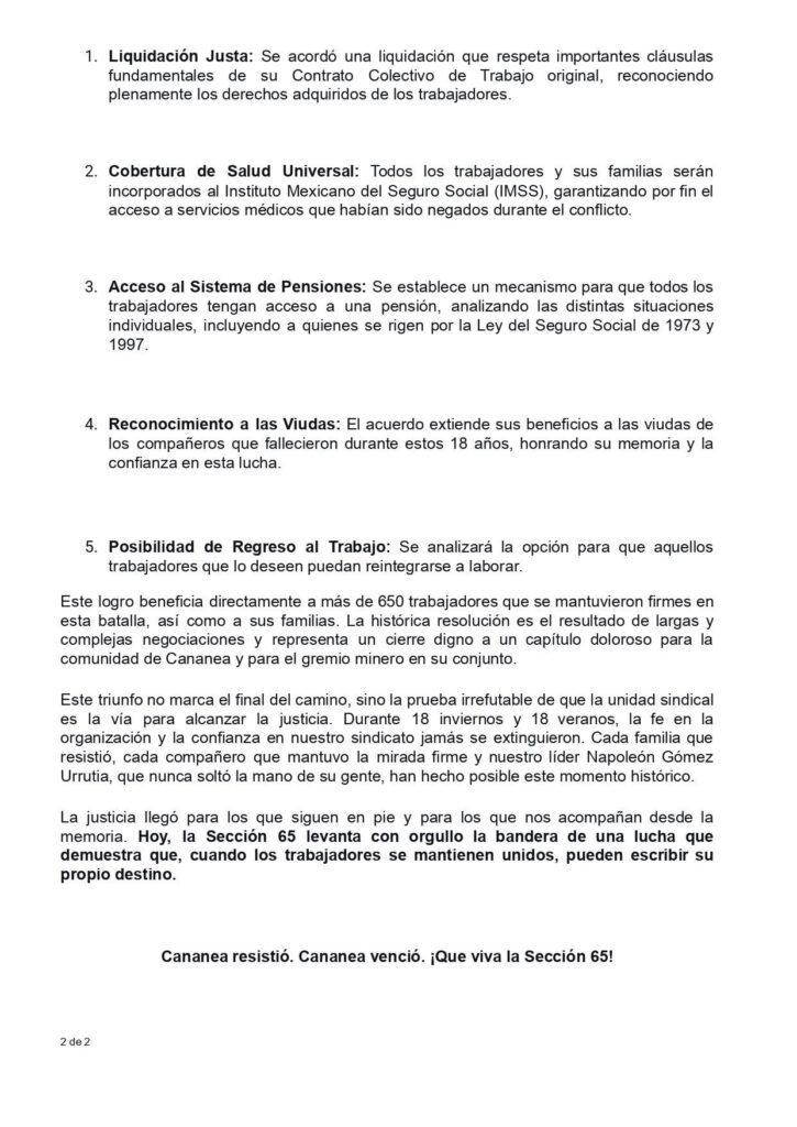 El acuerdo cierra un capítulo doloroso y oscuro. Sin embargo, la lucha minera no se termina hoy. En Sombrerete y Taxco, las huelgas siguen vivas y firmes.