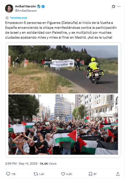 Regeneración, 15 de septiembre 2025– Las manifestaciones pro palestinas en Madrid han obligado a abandonar la última etapa de la Vuelta a España , en la que el danés Jonas Vingegaard ha sido declarado ganador general mientras la policía se enfrentaba a los manifestantes.
