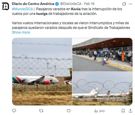 Regeneración, 17 de febrero 2026– Los empleados del Aeropuerto Internacional Jomo Kenyatta, el más destacado de Kenia y uno de los más relevantes de África oriental, decidieron poner fin este martes a la huelga que iniciaron el día anterior, lo que ocasionó retrasos, cancelaciones y desvíos de vuelos.