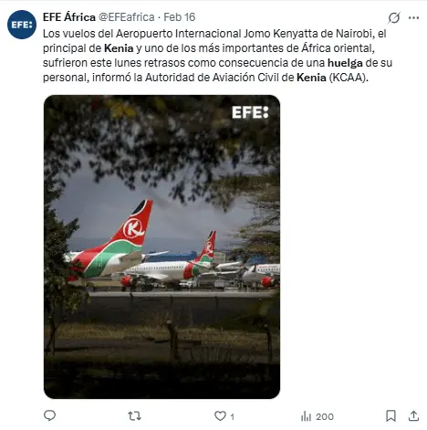 Así lo comunicó la Autoridad de Aeropuertos de Kenia en un mensaje que publicó en su cuenta de la red social X, donde no proporciona más información.