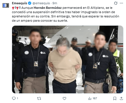 El Juzgado Cuarto de Distrito en materia Penal del Edomex admitió la demanda de garantías, aunque no se ha informado si se ha concedido la medida solicitada.