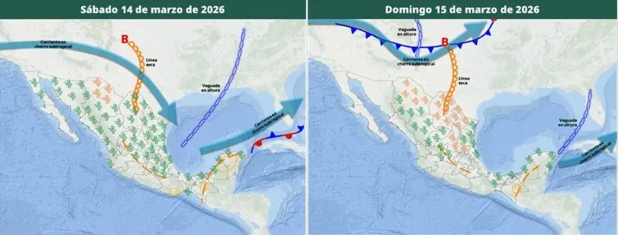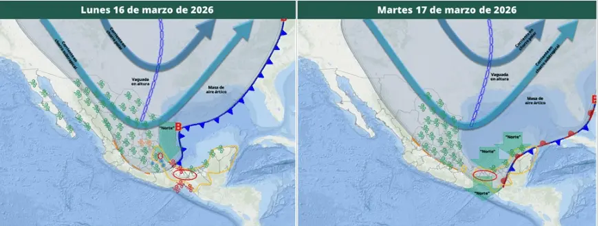 Por otro lado, una vaguada en altura se desplazará sobre el golfo de México y la península de Yucatán, en interacción con un canal de baja presión sobre dicha península y el sureste mexicano.