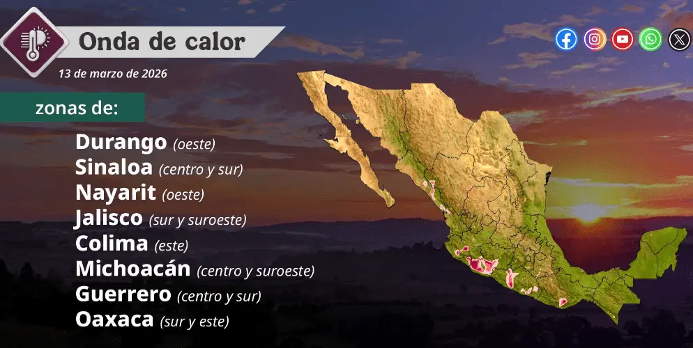 Además, continuará la onda de calor en Durango (oeste), Sinaloa (centro y sur), Nayarit (oeste), Jalisco (sur y suroeste), Colima (este), Michoacán (centro y suroeste), Guerrero (centro y sur) y Oaxaca (sur y este).