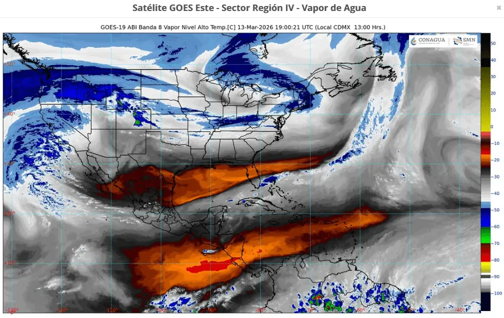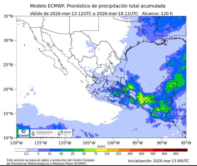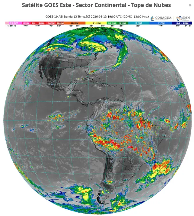 Regeneración, 13 de marzo de 2026. El Servicio Meteorológico Nacional (SMN) informó de lluvias puntuales muy fuertes en Chiapas, Campeche, Yucatán y Quintana Roo así como fuertes vientos.