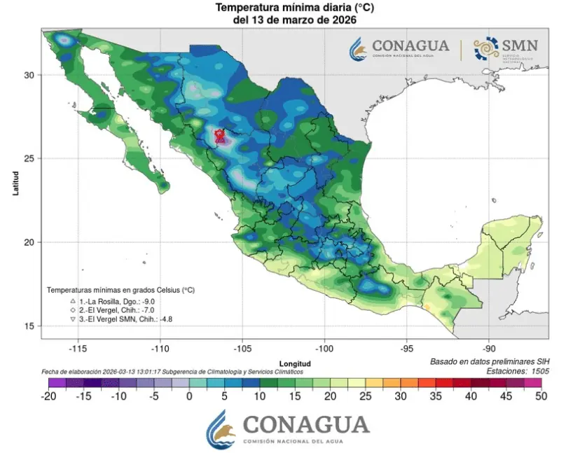 En contrapunto, temperaturas mínimas de -5 a 0 °C con heladas durante la madrugada del sábado: zonas serranas de Chihuahua, Durango y Estado de México.