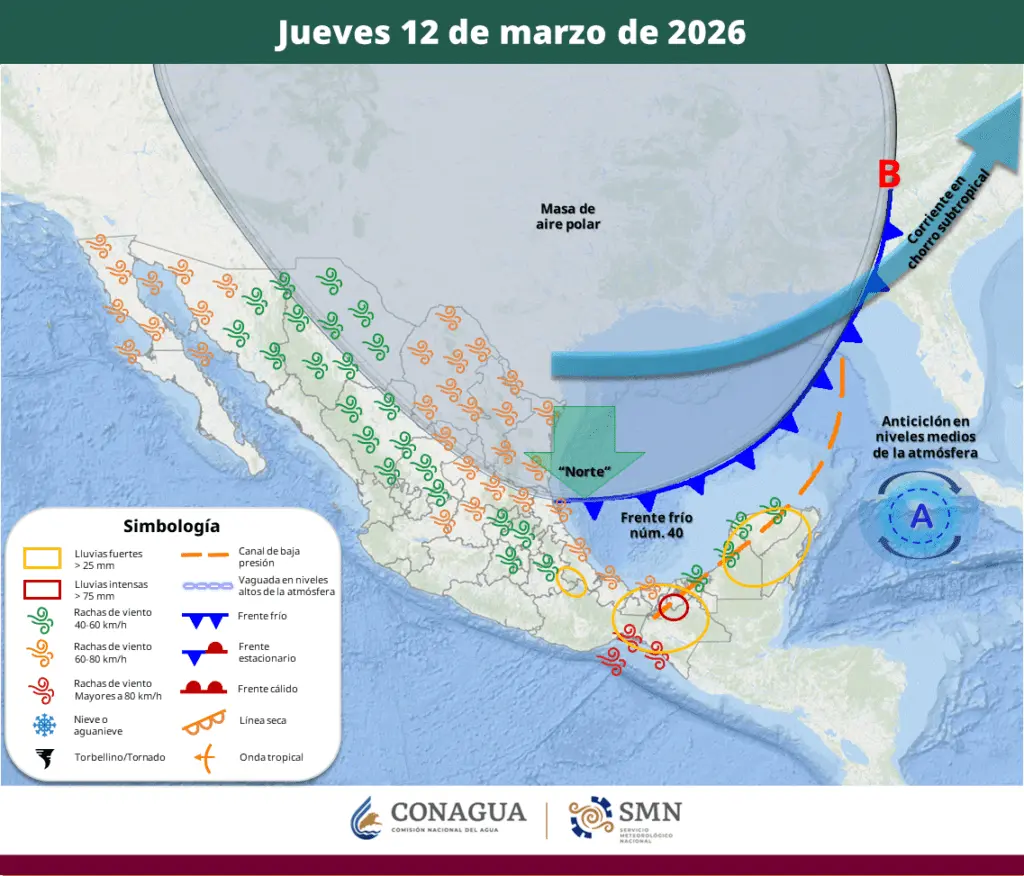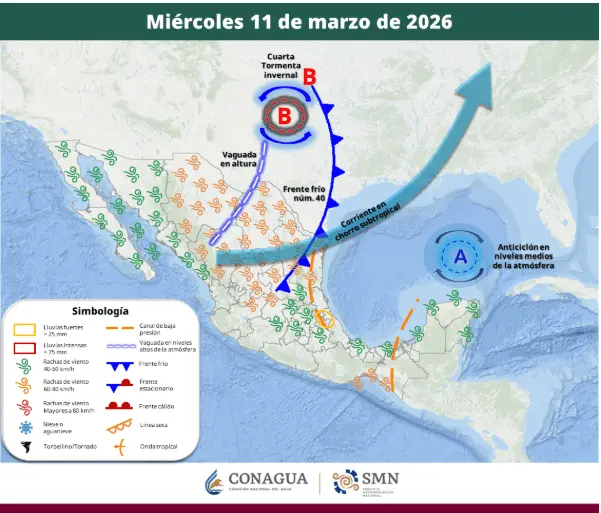 Regeneración, 10 de marzo 2026– El Servicio Meteorológico Nacional (SMN) ha informado que entre el martes 10 y la mañana del miércoles 11 de marzo, la Cuarta Tormenta Invernal se moverá lentamente sobre Sonora y Chihuahua, creando un ambiente frío, vientos muy fuertes, así como lluvias y chubascos en esas regiones, y en Durango.