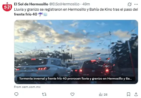 - Posible caída de nieve o aguanieve en sierras de Sonora y Chihuahua.