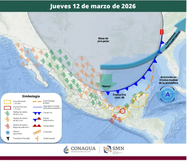 - Viento de 30 a 40 km/h con rachas de 50 a 70 km/h: Chihuahua, Durango, Coahuila, Nuevo León, Tamaulipas, Zacatecas, San Luis Potosí, Aguascalientes, Jalisco, Guanajuato e istmo y golfo de Tehuantepec (Oaxaca y Chiapas).