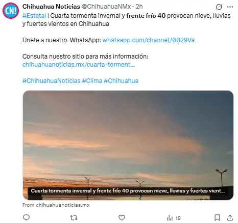 La Cuarta Tormenta Invernal y el frente frío 40, provocarán caída de nieve en el norte, y calor en el oeste y sureste: SMN