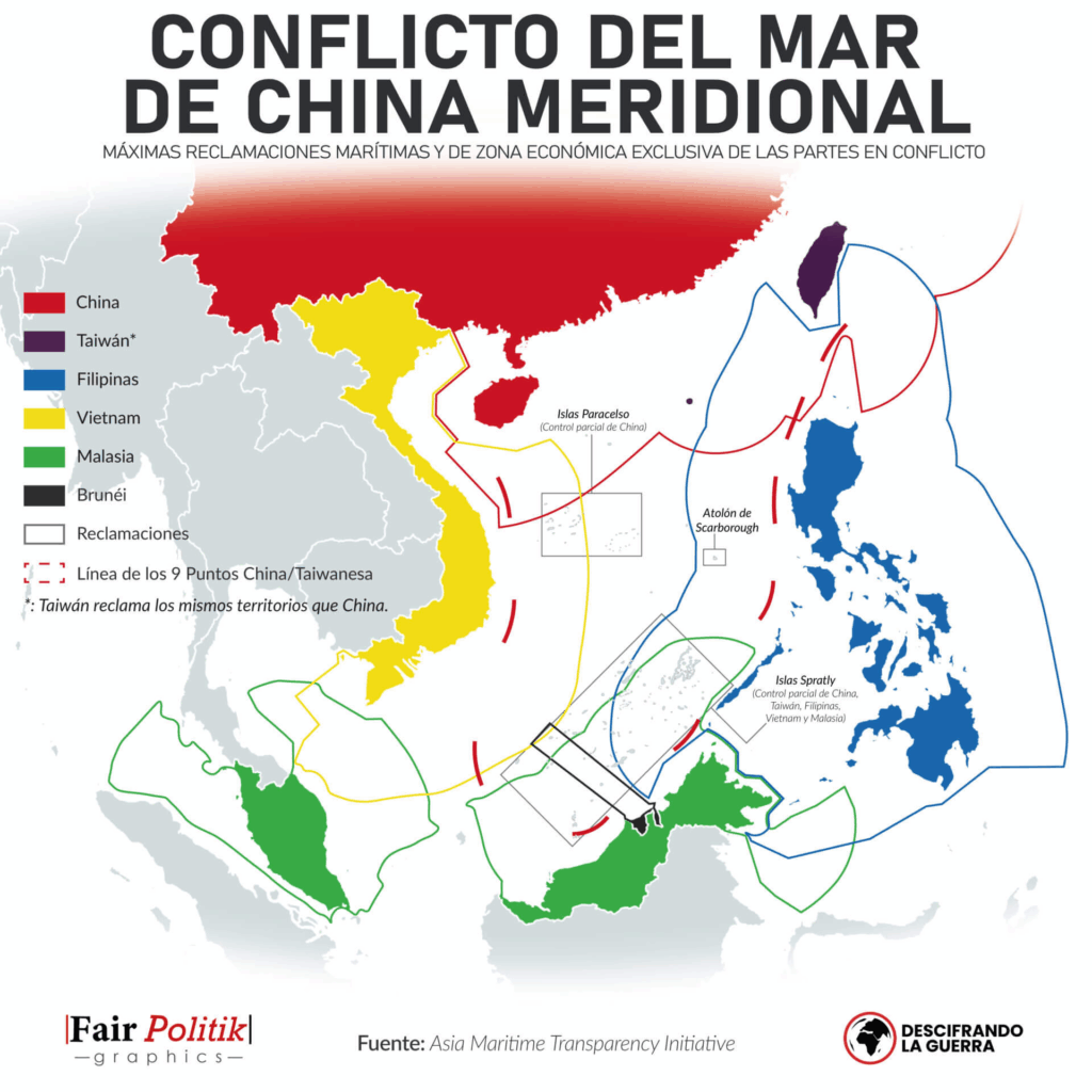 China reclama casi la totalidad del Mar Meridional, lo que se superpone con las zonas económicas de Filipinas, Brunei, Indonesia, Malasia y Vietnam.