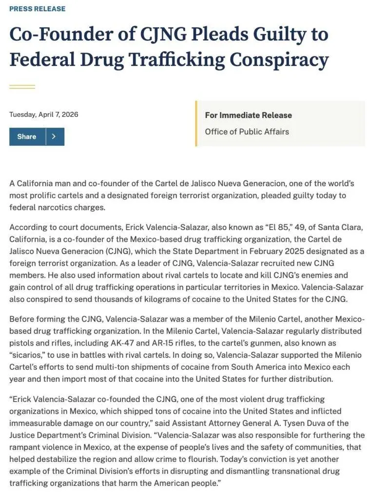Erick Valencia Salazar, cofundador del CJNG, admite cargos por distribución de cocaína en Washington. Enfrenta una posible cadena perpetua