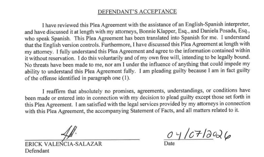 Entiendo plenamente este Acuerdo de Culpabilidad y acepto la información contenida en él sin reservas. Hago esto de manera voluntaria y por mi propia voluntad, con la intención de estar legalmente vinculado. No se me han hecho amenazas, ni estoy bajo la influencia de nada que pueda impedir mi capacidad de comprender plenamente este Acuerdo de Culpabilidad. Me declaro culpable…