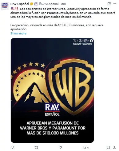 Regeneración, 23 de abril 2026– Este jueves, los accionistas de Warner Bros Discovery se pronunciarán sobre una posible fusión que podría modificar drásticamente el ambiente mediático estadounidense: la fusión de la compañía con Paramount Skydance.
