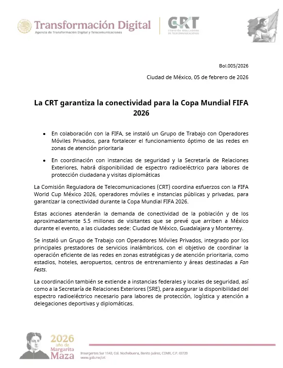 Regeneración, 5 de febrero de 2026.– La Comisión Reguladora de Telecomunicaciones (CRT) lidera un esfuerzo conjunto con la FIFA. El objetivo principal es garantizar la conectividad digital durante la Copa Mundial 2026. Esta iniciativa involucra a operadores móviles y diversas instancias públicas.