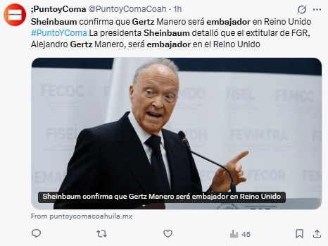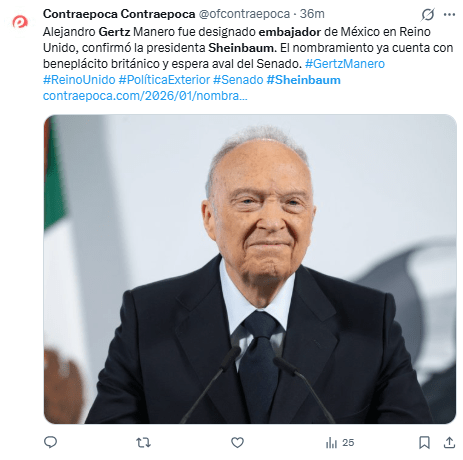 Regeneración, 7 de enero 2026– En su carta de renuncia, el exfiscal Alejandro Gertz Manero mencionó que sería designado embajador de «un país amigo» y el 7 de enero la presidenta Claudia Sheinbaum declaró que ese país es el Reino Unido.