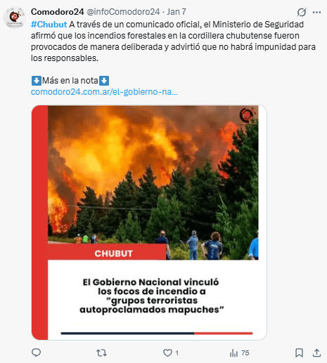 Regeneración, 8 de enero 2026– El Gobierno Argentino señaló la existencia de grupos radicalizados mapuches en la zona donde se originó el incendio que ya devastó más de 2200 hectáreas. Las autoridades de Chubut aclararon que no se trata de imputar directamente, pero el fuego fue provocado.