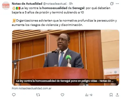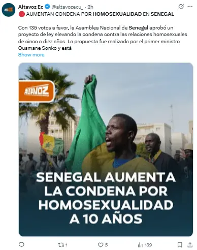 En el marco jurídico senegalés, la homosexualidad se equipara a comportamientos como la necrofilia o la zoofilia.