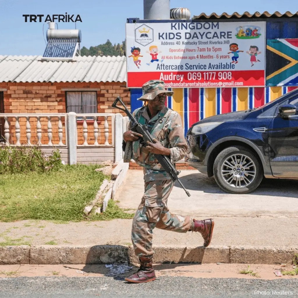 Las tropas, montadas en vehículos blindados, realizaron patrullajes en Eldorado Park y Riverlea, dos barrios de clase trabajadora.