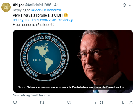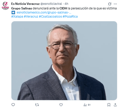 Regeneración, 28 de octubre 2025– Grupo Salinas anunció que acudirá a la Corte Interamericana de Derechos Humanos (CIDH), señalando una “sistemática persecución” en su contra por parte del gobierno federal.