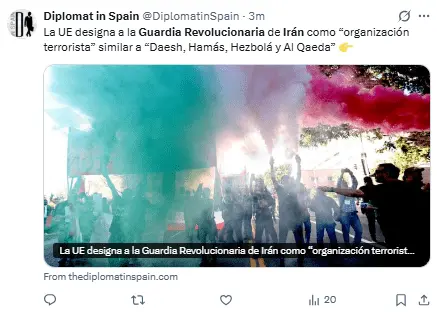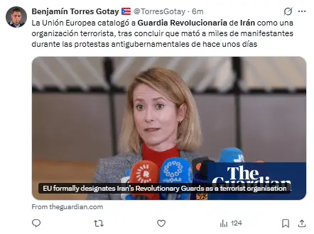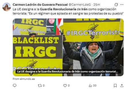 Regeneración, 29 de enero 2026– La UE ha decidido por consenso declarar terrorista a la Guardia Revolucionaria Islámica. Esta decisión, promovida por los gobiernos de España, Francia y Alemania, se debe a la represión de manifestantes y la presión de Donald Trump.