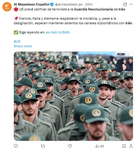 La Unión Europea (UE) ha alcanzado el consenso necesario para catalogar al Cuerpo de la Guardia Revolucionaria Islámica de Irán (CGRI) como organización terrorista.