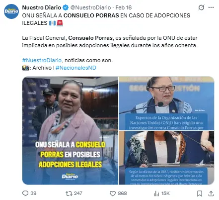 Regeneración, 19 de febrero de 2026 – Este miércoles, el gobierno de Guatemala notificó que ha solicitado a la Fiscalía una indagatoria sobre una supuesta implicación de la fiscal general, Consuelo Porras, en adopciones ilegales en la década de 1980, según un grupo de expertos de la ONU.