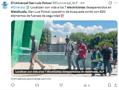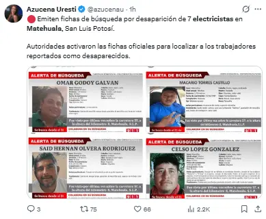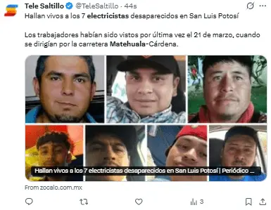 Según los informes, los desaparecidos son electricistas originarios del municipio de Cárdenas, San Luis Potosí.