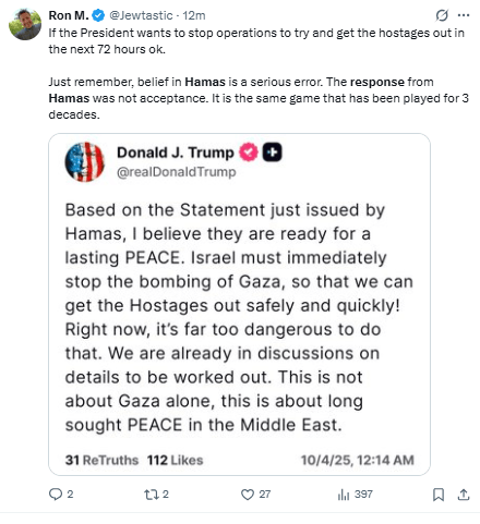 Regeneración, 3 de octubre 2025– El grupo palestino Hamás presentó su respuesta al plan de Trump sobre Gaza el viernes, horas después de que el presidente estadounidense anunciara la fecha límite el domingo, y afirmó estar dispuesto a liberar a todos los rehenes.