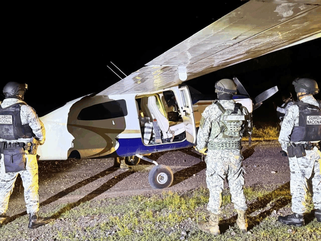 «La aeronave aterrizó en una pista aérea clandestina en Tecomán, Colima. Elementos de Guardia Nacional y Defensa aplicaron el “P.S.O. para la Revisión de Aeronaves”».