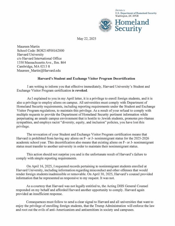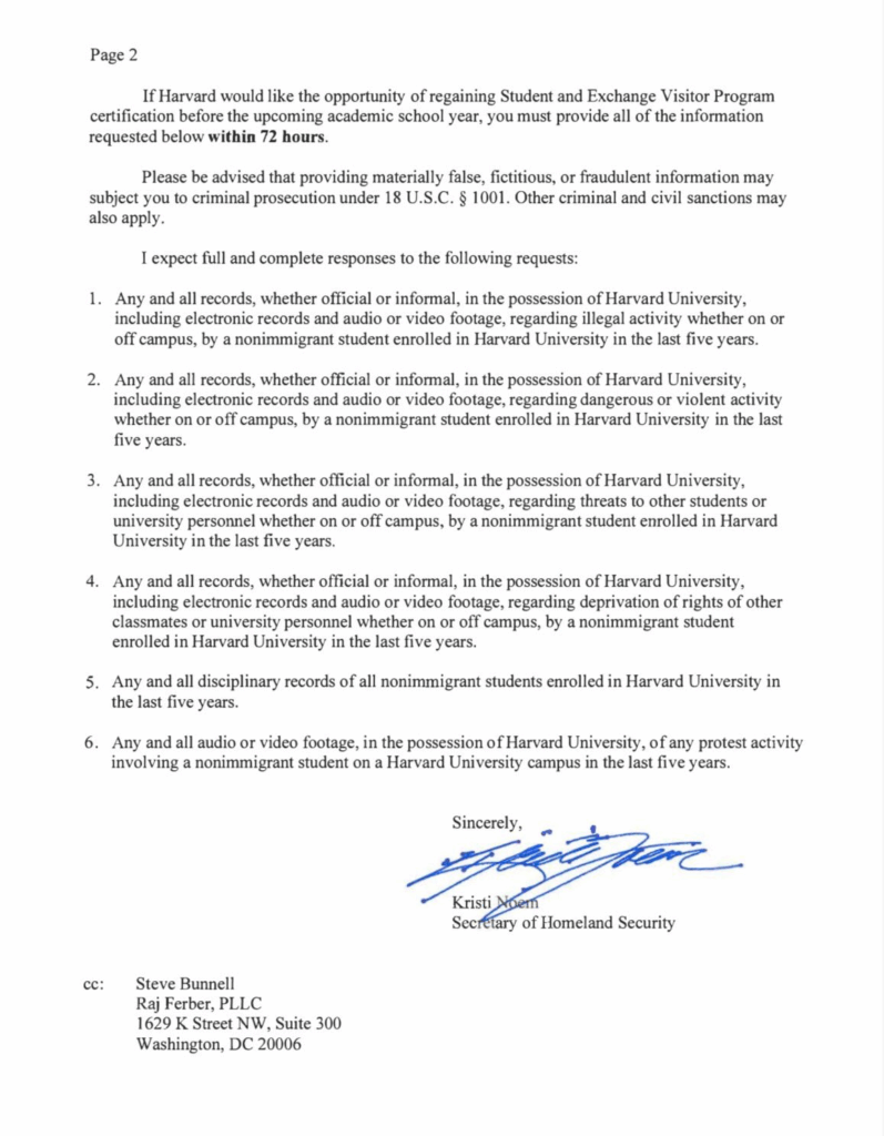 Misma, en la que, además, se detallan los requisitos que Harvard debe cumplir para recuperar su estatus.