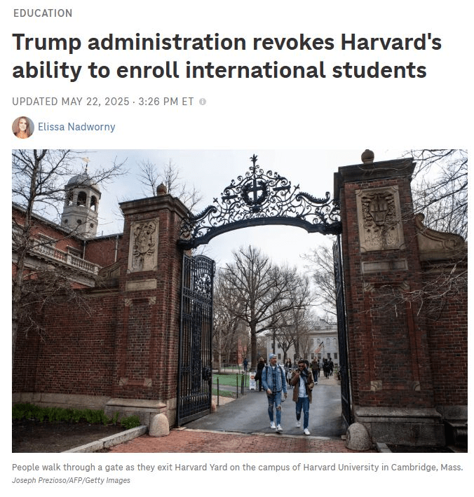Regeneración, 22 de mayo de 2025. El gobierno de Trump emitió un ultimátum a la Universidad de Harvard, retirando su certificación para recibir estudiantes extranjeros.