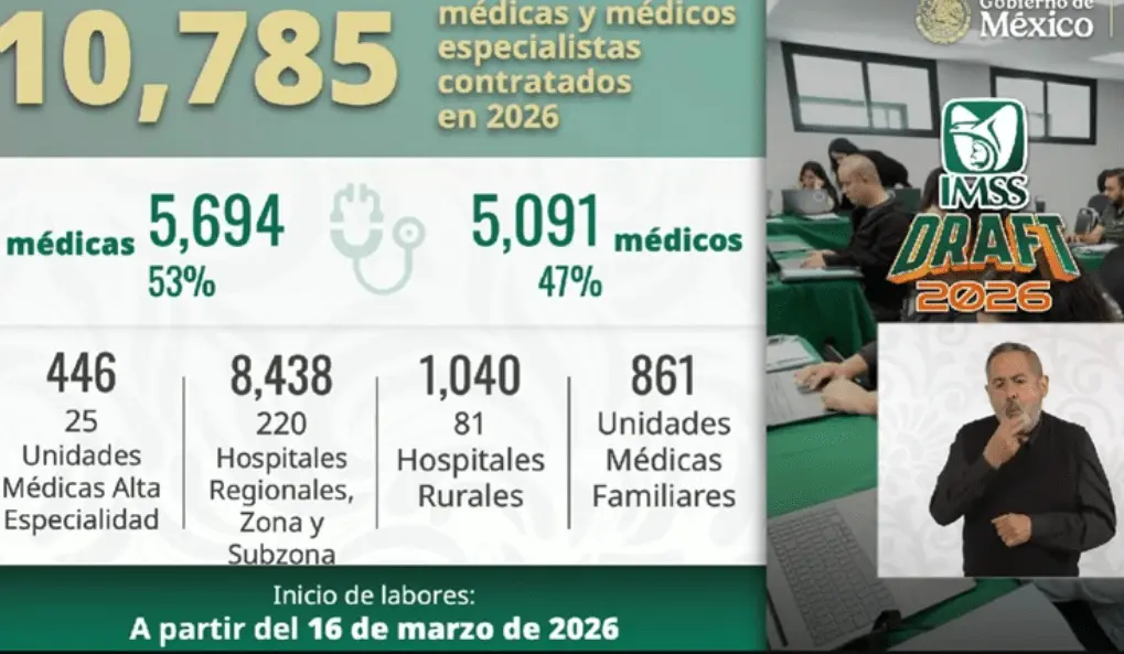 De los cuales, 5 mil 694 mujeres y 5 mil 91 hombres. De ellos, 446 van a Unidades Médicas de Alta Especialidad; 8 mil 438 a hospitales regionales, de zona y subzona.