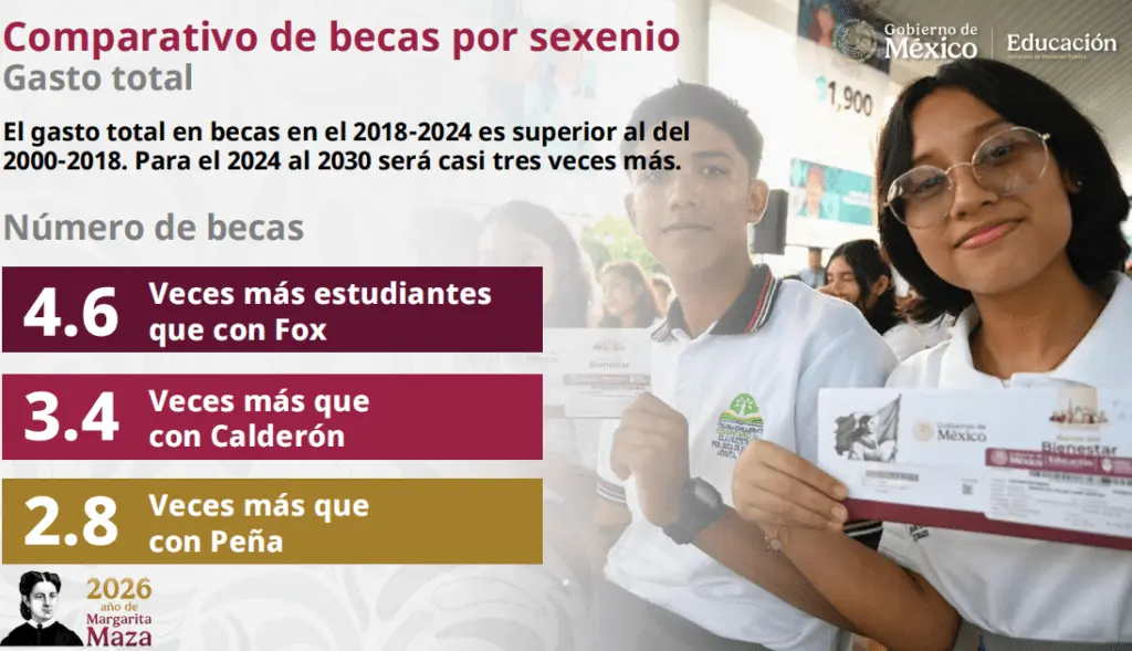 Agregó que con esta inversión se estima que serán entregadas 129.5 millones de becas a estudiantes, lo que representa 4.6 veces más que lo otorgado con Vicente Fox.