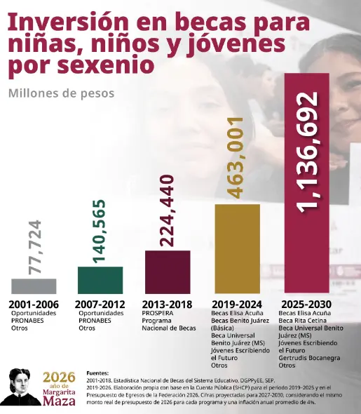 Regeneración, 13 de abril de 2026. La presidenta Sheinbaum subrayó que la inversión en becas para estudiantes a 2030 es casi tres veces mayor a lo destinado en 18 años del periodo neoliberal.