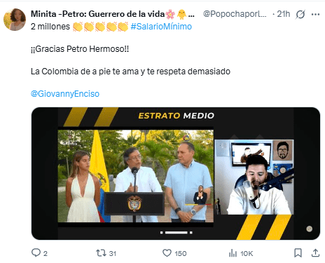 Con Petro el salario mínimo (con apoyo de transporte) pasó de $1.117.172 en 2022 a $2.000.000 para 2026: Es decir 79% de beneficios